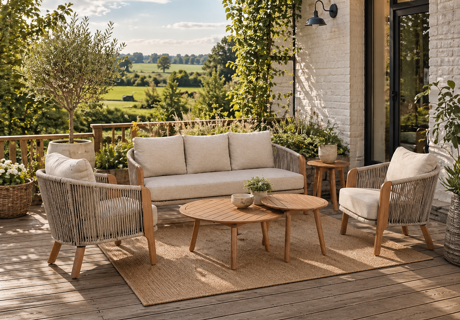 Le tressage en corde Olefin de 6 mm offre une excellente résistance aux conditions extérieures tout en assurant un confort optimal. Idéal pour créer un espace lounge raffiné, le set Brumar s’intègre parfaitement dans une terrasse moderne ou un jardin verdoyant.